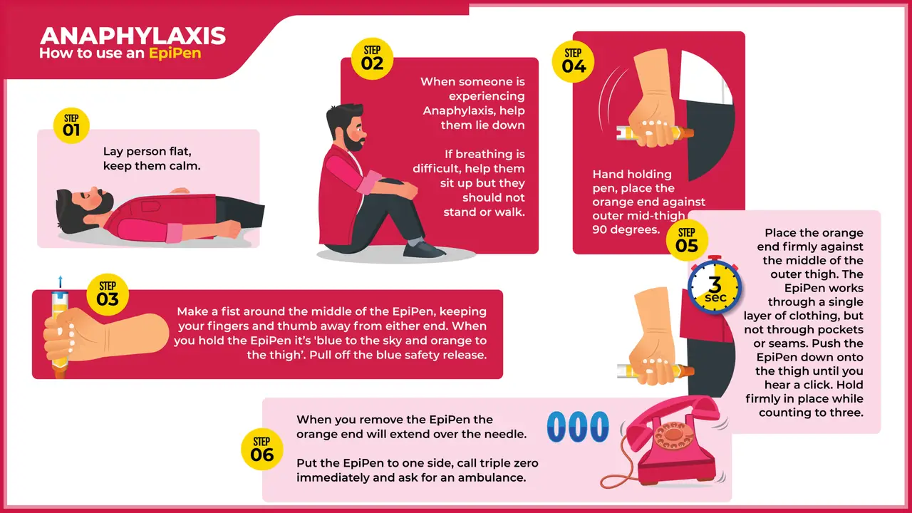 These auto-injectors are designed to be used by anyone: a friend, childcare worker, parent, teacher, passer-by, or even the casualty themselves. To care for and treat a casualty experiencing anaphylaxis, the below steps should be followed: